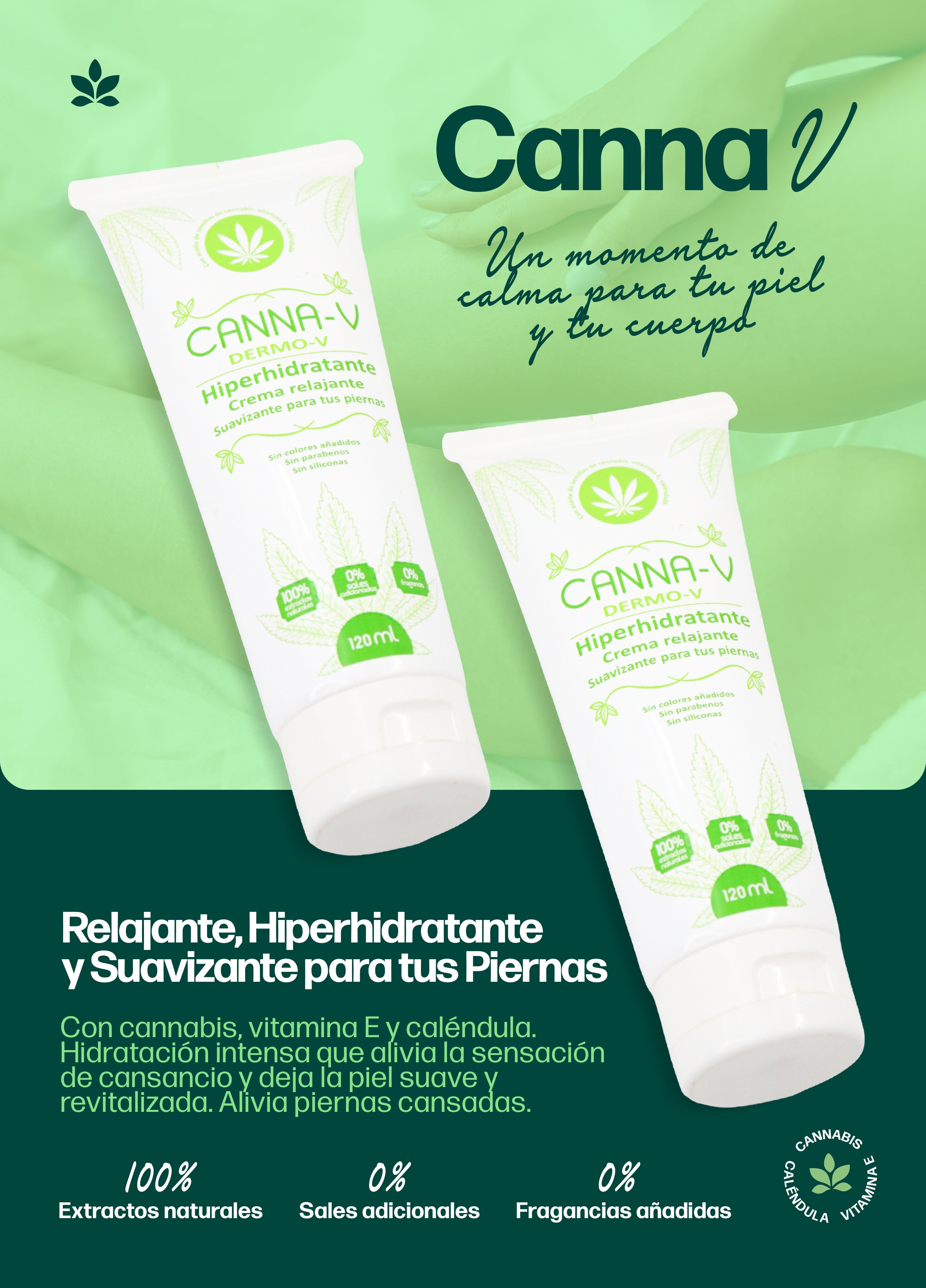 🌿 CANNA-V es una crema que combina hidratación profunda con una sensación de frescura y alivio total. Su fórmula nutre intensamente, dejando la piel suave, flexible y revitalizada. Ideal para quienes buscan relajar y descongestionar piernas cansadas o con sensación de pesadez. 💚 Tu piel descansada, hidratada y lista para brillar. ✨